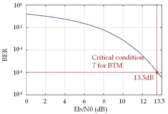 The relationship between Signal Noise Ratio (SNR) and Bit Error Rate (BER) of BTM signal Su could be calculated by Equation (15). According to European standard SUBSET 036, the BER of BTM system should be below 10−6 when BTM system carries out F1 [7] and F3 function. Thus, the SNR of output signal Su should be larger than 13.5 dB according to BER of BTM system of Figure 15. That means, in function F1 and F3, the BTM should receive correct data when the SNR of Su is larger than 13.5 dB. And if the SNR of Su is lower than 13.5 dB, the BTM will fail to start or report erroneously localization of a balise even balise missing. Thus, the critical condition T could be set at SNR = 13.5 dB.
