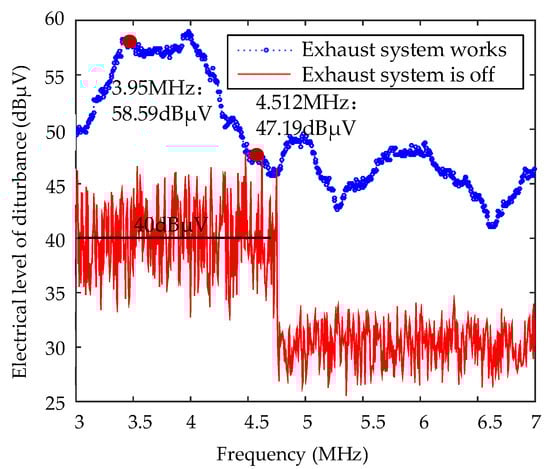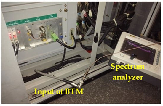 To validate sensitive equipment module, field tests are carried out, shown in Figure 17. The differential-mode disturbance at the input of BTM is tested by the spectrum analyzer when the train stops and runs. For this train, the exhaust system locates near the on-board antenna of BTM. It may produce disturbance. In the test, when the train is running normally, BTM system could normally operate. If the train is going to run and the exhaust system power on initially, BTM system cannot start and the train cannot run either. However, if shutting down the exhaust system and making the BTM system start first, the train could start to work successfully. The disturbance at the input of BTM is shown in Figure 18. When the exhaust system works, the disturbance level is 58.59 dBμV at 3.95 MHz and 47.19 dBμV at 4.512 MHz. If the exhaust system is powered off, the disturbance level is around 40 dBμV at both 3.95 MHz and 4.512 MHz for this field test.