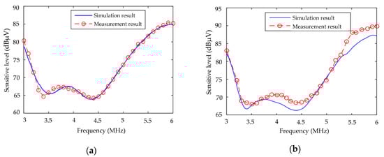 The predicted result shows that no matter what function the BTM system carries out, the most sensitive frequency is in the BTM operating frequency range. According to Figure 20a, the maximum error between the results of measurement and our model is only 1.45 dB at 3.4 MHz when BTM system takes the function F2. Between 3.9 MHz and 4.6 MHz, the maximum absolute error is 0.4 dB. The BTM system will report an error when the voltage of disturbance Sn is larger than 64 dBμV. Figure 20b is the comparison result when the on-board antenna is in the contact zone and the BTM system carries out the function F3. Between 3.4 MHz and 4.6 MHz, the maximum absolute error is 2.8 dB. In this band, the sensitivity level got from the simulation is lower than the result of the measurement. That difference may be caused by ignoring the self-error correcting ability of BTM system. Thus, this immunity of the testing on BTM system is better than the theory analysis result. The disturbance Sn should be smaller than 67 dBμV to make sure the BTM system performs normal work.