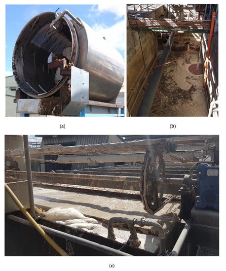 Resource recovery from waste streams is an important consideration both for retaining high-value product and for reducing the impact on down-stream processes such as anaerobic digestion. The eco-efficiency manual [13] identifies and discusses several engineering solutions which have been developed to recover organic solids from the wastewater prior to discharge from the abattoir. Of particular interest is the recovery of FOG. From a resource recovery perspective, tallow produced from rendered fat currently sells for around $750 AUD·t−1 [14]. Consequently, tallow is a valuable resource to the RMP industry, and the optimisation of fat recovery is a priority. Once fat enters the wastewater system there are several primary wastewater treatment systems which range from simple low-cost screens to more complex and expensive machinery used to recover fat. The eco-efficiency manual for meat processing [13] identifies several of these technologies, their costs and indicative capacities for fat recovery. Importantly, many RMP facilities operate screens (Figure 1a), save-alls (Figure 1b) and dissolved air flotation units (Figure 1c) for which the manual indicates fat recovery of 20–90%, 50–85% and 60–90% respectively. However, data collected by McCabe, Schmidt and Harris [11] and presented alongside industry data in Table 1 further demonstrated that even with these technologies in place, large amounts of fat can pass through to secondary treatment processes such as anaerobic lagoons (Table 1).