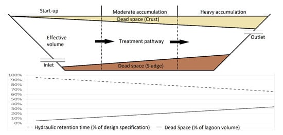 Figure 2. Cross-sectional representation of an anaerobic lagoon accumulating dead space (as crust and sludge) over time and the resulting impact on the effective volume and consequently the coupled parameters of hydraulic retention time and treatment efficiency. - (b)