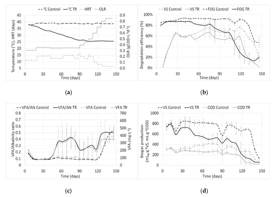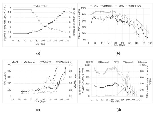 (a) Organic loading rate and hydraulic retention times in control and TE (trace element)-supplemented reactors [28]; (b) vs. and FOG degradation efficiency in control and TE-supplemented reactors [28]; (c) VFA and VFA/Alkalinity ratio in control and TE-supplemented reactors [28] and; (d) biogas production from control and TE-supplemented reactors as both functions of vs. and COD. Error bars represent one standard deviation from the mean.