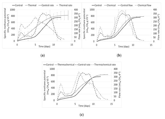 Specific methane potentials and production rates of: (a) thermally treated dissolved air flotation (DAF) sludge from a red meat processor [42]; (b) chemically treated DAF sludge [42]; (c) thermos-chemically treated DAF sludge [42]. Error bars represent one standard deviation from the mean.