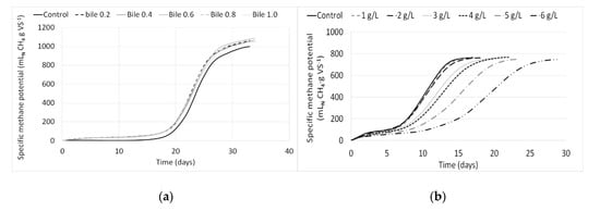 Specific methane potential from DAF sludge treated with bile in doses ranging from: (a) 0.2–1 g bile·L−1 and; (b) 1–6 g bile·L−1 [43].