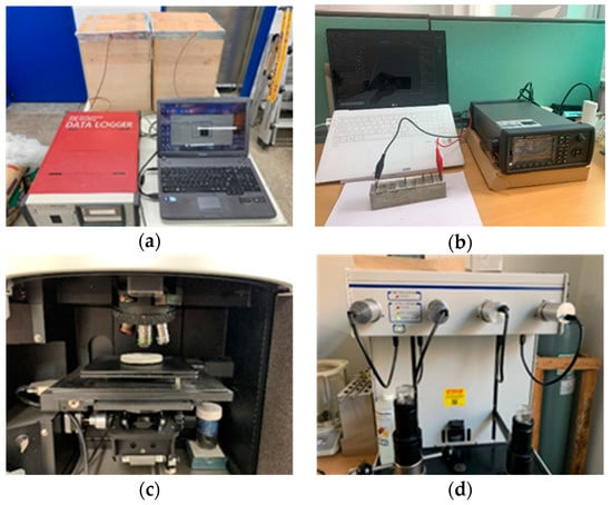 Experiment equipment. (a) Heat of hydration; (b) electrical resistance; (c) Raman spectrophotometer; and (d) mercury porosimeter.