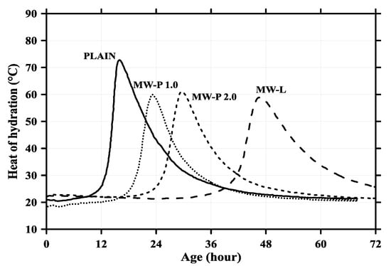 Figure 5 presents the heat of hydration curve. Since the MWCNTs were added, regardless of whether they were powder or liquid, it was observed that the heat of the hydration decreased by approximately 10 °C to 14 °C compared with the plain cement paste. In Figure 4, MW-P1.0, MW-P2.0, and MW-L signify the powder MWCNTs, with a 1.0% mass fraction of cement and silica fume for the powder MWCNTs and a 2.0% mass fraction of cement and silica fume for the liquid MWCNTs, respectively. The primary reason for the rapid shift of the heat of hydration to the right was the high thermal conductivity of the MWCNTs. In addition, the maximum values of the heat of hydration for the plain, MW-P1.0, MW-P 2.0, and MW-L MWCNTs were measured at 14, 30, 46, and 26 h, respectively. This is not due to the direct impact of the MWCNTs, but because of condensation delay, as the amount of the chemical admixture was excessively added at 5–12%.