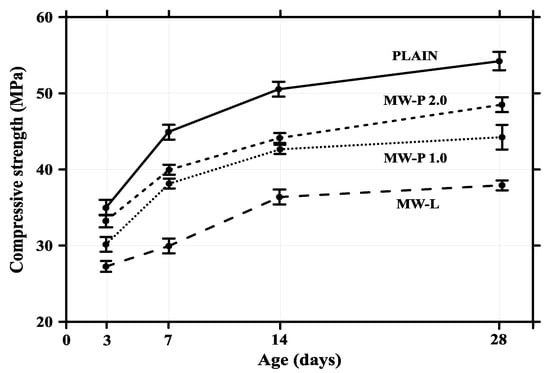 The compressive strengths of four different composites are shown in Figure 7. Similar to the findings of previous research conducted by Oh et al. [,], the decreasing trend of compressive strength was exhibited as the MWCNTs were added, and the strength further decreased as the addition ratio increased. The compressive strength decreased by 10 to 16 MPa, compared with the plain cement paste at 28 days. The chemical reaction of the MWCNTs did not occur in the cement composite as it did in the heat flow results because the decrease in compressive strength resulted from the intorsion and agglomeration of the MWCNTs, caused by the van der Waals forces in the cement composite. It was suggested that if the nano-sized MWCNTs do not achieve homogeneous dispersion, they cannot lead to densification due to the micro-filler effect in the cement composite. However, the MW-L case was relatively dispersive compared with MW-P1.0 or MW-P2.0, so the decrease in strength of the liquid type was not greater than the powder type.