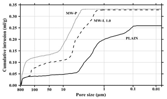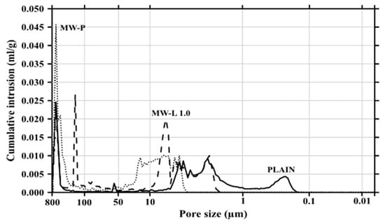 Figure 8 and Figure 9 show the cumulative pore volume and pore size distribution, respectively, measured by mercury intrusion porosimetry. In Figure 8, the pore volume in the cement composites increased with the addition of MWCNTs. In theory [,], MWCNTs in the size range of 5–100 nm reduced the pore volume due to the filling effect of the composites. However, if homogeneous dispersion was not achieved, the pore volume increased. In particular, the pore size distribution in Figure 9 revealed that the amount of relatively large micro-pores increased with the MWCNTs, while that of small micro-pores decreased as the MWCNTs were added. This implies that the intorsion and agglomeration of the MWCNTs occurred due to van der Waals forces, and thus the compressive strength of the cement composite incorporating the MWCNTs decreased as large micro-pores appeared.