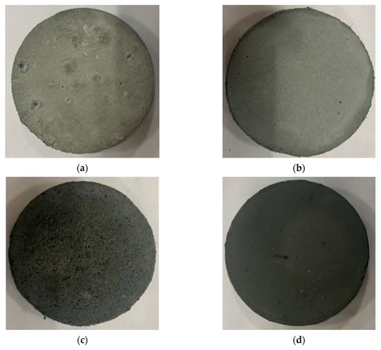 Specimens for Raman spectroscopy. (a) Plain; (b) MW-P1.0; (c) MW-P2.0; and (d) MW-L.
