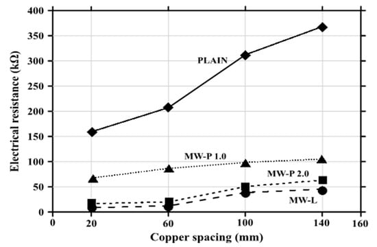 The electrical resistance values, according to the measurement distance, are demonstrated in Figure 13. It was found that (1) as the addition ratio of the MWCNTs increased, the electrical resistance value decreased, and (2) the shorter the measurement distance, the smaller the electrical resistance value. Even though MWCNT agglomeration occurred in the cement composites, it spread throughout the entire structure, reducing the electrical resistance value. Furthermore, the electrical resistance decreased even in the liquid state specimen, denoting relatively good dispersion. This finding implies that the MWCNT-added cement composite exhibits electrical conductivity, regardless of homogeneous dispersion.