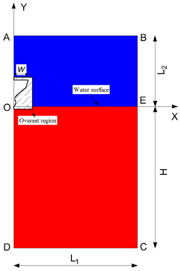 where and are the density and viscosity of air, while and are the density and viscosity of water. γ is the volume fraction of air; γ = 0 denotes that the fluid in the cell is water, whereas γ = 1 is air. If 0 < γ < 1, it means that a combination of air and water exists in the cell. By means of Equations (3) and (4), the property of a cell can be predicted. The governing equation of γ is as follows: