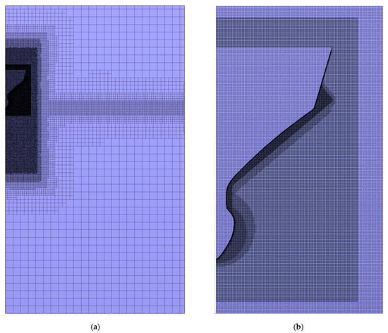 Figure 2a shows the mesh view of the global domain. An overset mesh was applied to model the motion of the bow-flared section, and it is shown in black color in Figure 2a. The motion of the bow-flared section was specified in accordance with the velocity curve. In order to accurately simulate the interaction between the section and the water, fine mesh was assigned to the region where the section might pass. Figure 2b shows the fine mesh near the section.