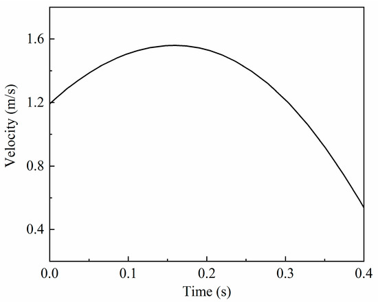 The water entry of several different bow-flared sections, including the original section and the simplified sections, was simulated using the validated numerical method. The profiles of the sections are shown in Figure 3. In the figure, S1 is the original bow-flared section, and S2–S4 are the three simplified bow-flared sections given by Hermundstad and Moan [16]. The motion of the sections was specified by the same velocity curve, as shown in Figure 4. Then, the free surface evolution, pressure field, and impact force during the water entry of different bow-flared sections were comparatively studied.