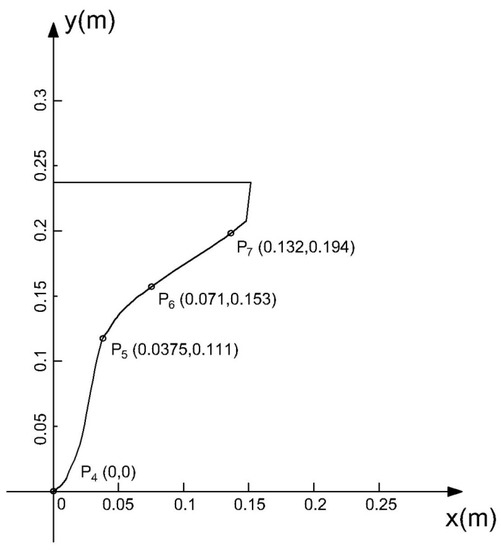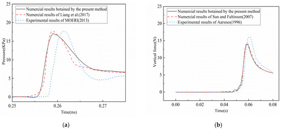 The shape of the bow-flared section in the drop test by Aarsnes [9] is shown in Figure 7. The section was symmetrical, so only half of the section is shown. P4–P7 are the positions where the pressure sensors were installed. The total weight of the falling rig was 261 kg. The total length of the ship bow section was 1.0 m. The initial impact velocity was 2.43 m/s, corresponding to the time when the section touched the still water surface. Figure 8 shows a comparison between the experimental results of Aarsnes [9] and numerical results. Because Aarsnes’s section had no obvious bulbous bow structure, the second slamming phenomenon did not appear in the process of water entry. Sun and Faltinsen [8] validated the nonlinear boundary element method by comparison with Aarsnes’s drop tests, and the results of the boundary element method are also shown in Figure 8. As can be seen in the figure, the numerical results obtained by the present method are in good agreement with the experimental results reported by Aarsnes [9] and the numerical results reported by Sun and Faltinsen [8]. Because the three-dimensional effect in the drop tests was not taken into account in the present numerical simulation and in the study by Sun and Faltinsen [8], the numerical results obtained by the present method are closer to those reported by Sun and Faltinsen [8], especially for the impact pressure of P5, P6, and P7.