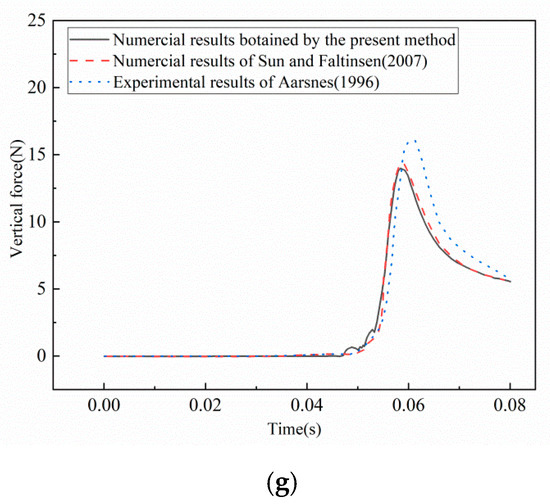 Considering that the secondary slamming phenomenon may appear during the water entry impact of a bow-flared section, the two previous drop tests were simulated using the present method, which corresponded to the water entry without and with the secondary slamming phenomenon, respectively.