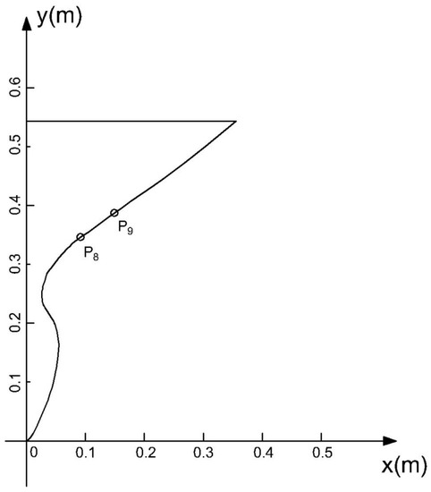 In the Wave Induced Loads on Ships (WILS) Joint Industry Project [28], a drop test of a symmetrical bow-flared section was performed. The profile of half section is shown in Figure 9. Unlike the bow-flared section of Aarsnes [9], the profile in Figure 9 has an obvious bulbous bow structure. P8 and P9 are the positions where the pressure sensors were installed. The initial impact velocity was 2.43 m/s. Figure 10 shows the free surface elevations obtained by the present numerical study and the drop test. It can be seen that the present numerical method could reasonably predict the free surface elevation near the dropping section, and the second slamming phenomenon caused by the bulbous bow structure was also well simulated. Figure 11 shows the contrastive results for the water entry of MOERI’s bow-flared section. The results of the immersed boundary method in the work of Yang et al. [11] are also shown in Figure 11. It can be seen that even if the second slamming phenomena appeared, the present numerical method could reasonably predict the impact pressure on the dropping section.