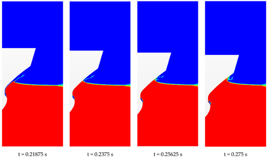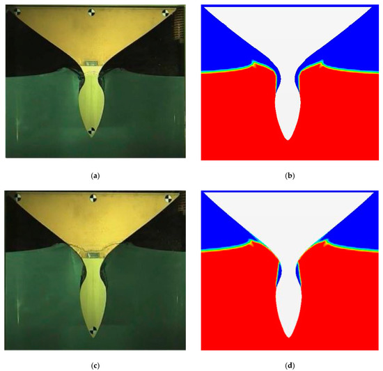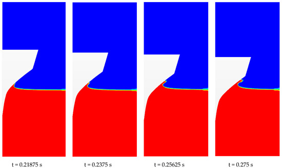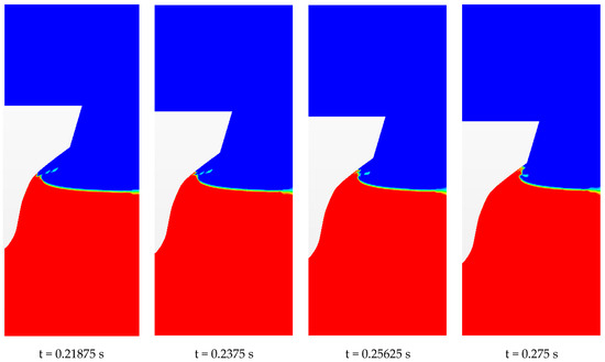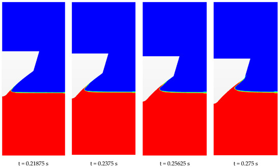 Figure 12, Figure 13, Figure 14 and Figure 15 show the free surface evolution during the water entry of different bow-flared sections. For the water entry of the original section S1, the free surface was separated from the section at the bulbous bow location. Then, the separated fluid impacted on the section again. In the process of secondary slamming, a small amount of air was captured, and a cavity was formed in the flow field. For the water entry of the simplified bow-flared sections, the free surface was gradually raised along the section, and the secondary slamming did not appear, as shown in Figure 13, Figure 14 and Figure 15.