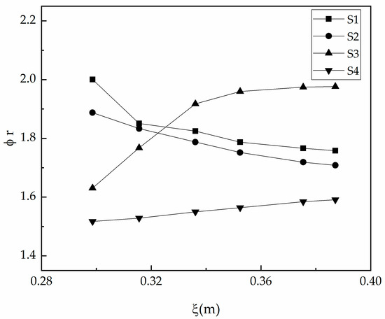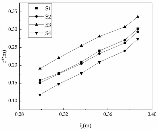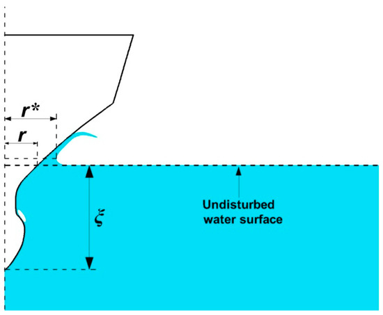 As shown in Figure 3, the original section and the simplified sections had the same bow-flared profile when y was greater than 0.4, while the simplified section S3 had a larger width when y was smaller than 0.4. In order to analyze the influence of different simplified options on water surface elevation, wetted length and pile-up coefficient were introduced and comparatively studied. Figure 16 illustrates the wetted length r* and the reference wetted length r corresponding to the penetration depth ξ. The pile-up coefficient ϕr is defined as ϕr = r*/r. It should be noted that the penetration depth of different sections is defined as the depth of the origin of the coordinate system XOY entering into the still water surface. Therefore, the lowest point of section S4 just touched the still water surface when the penetration depth ξ was 0.248 m.