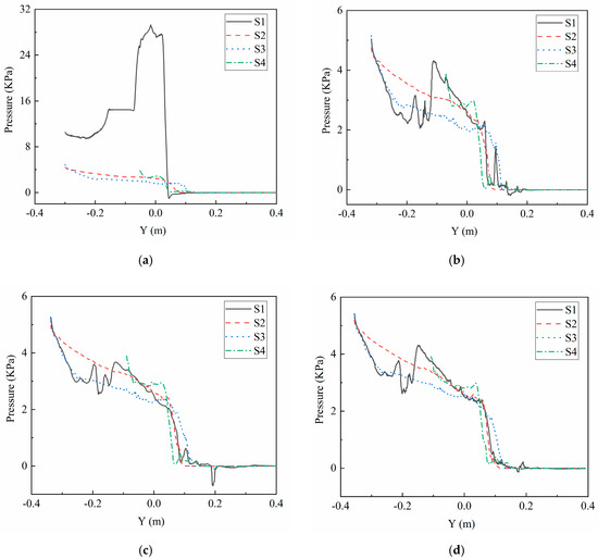 Figure 19 shows the pressure distribution on the wetted surface for different sections. The abscissa is the vertical coordinate of each position on the section in the XOY coordinate system. At time t = 0.225 s, the impact pressure of the original section was significantly higher than that of the simplified sections. In the secondary slamming phenomenon of the original section, the water separated at the bulbous bow will impact the bow-flared section again. As shown in Figure 12, the interface of the separated water was approximately parallel to the profile of the section. According to studies on water entry of wedges [6,29], a smaller dead rise angle will induce a larger impact pressure during water entry with the same impact velocity. Therefore, a large impact pressure is generated in the process of secondary slamming. Because there was no secondary slamming phenomenon in the water impact of the simplified sections, the pressure value at time t = 0.225 s of the simplified sections was relatively small. At subsequent times, the pressure distributions of different sections were generally close together. The pressure value of section S2 was slightly larger than that of section S3.