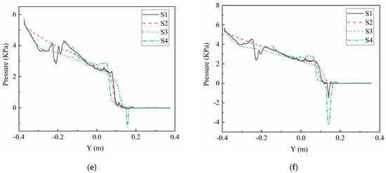Pressure distribution on the wetted surface for different sections: (a) t = 0.225 s; (b) t = 0.2375 s; (c) t = 0.25 s; (d) t = 0.2625 s; (e) t = 0.275 s; (f) t = 0.2875 s.
