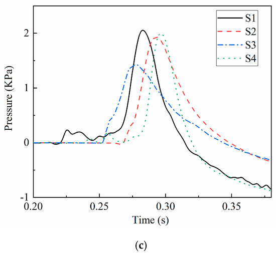 Figure 20 shows the history of the impact pressure of different positions. It can be seen that the secondary slamming phenomenon had a significant effect on the pressure at position P1. The P1 pressure value given by the original section S1 was significantly larger than that given by the simplified sections. For the pressure at P2 and P3, the impact pressures given by different sections were generally close. For the pressure peak at P2 of the original section, section S3 was underestimated by 14.1%, and section S2 and section S4 were overestimated by 1.8% and 22.6%, respectively. For the pressure peak at P3 of the original section, S2, S3, and S4 were underestimated by 5.8%, 32.6%, and 4.2%, respectively.