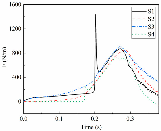 Table 1 shows the number of grids and time steps for four different sets of simulations. Figure 5 shows impact forces and impact pressures of section “S1” with different mesh densities and the corresponding time steps. Figure 6 shows impact forces and impact pressures of section “S2” with different mesh densities and the corresponding time steps. It can be seen that there were obvious differences between the results of the M1 case and the M3 case. With the decrease of grid size, the deviation of the predictions between different grid configurations decreased, and the results of the M3 case and the M4 case are in good agreement. Considering both the accuracy of results and the time consumed in the present work, M3 was used in the following studies.