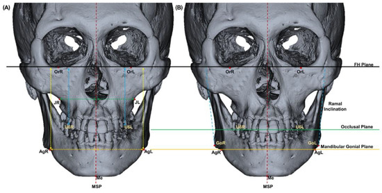 We maintained the original image orientation of the CBCT data and identified the landmarks on the 3D surface models directly in combination with multiplanar reformatting (MPR). We compared the differences in absolute distance between the measured parameters on the right and left against the MSP to evaluate frontal symmetry. We calculated the angular measurements to evaluate the respective roll angles against the horizontal reference plane (Figure 1).