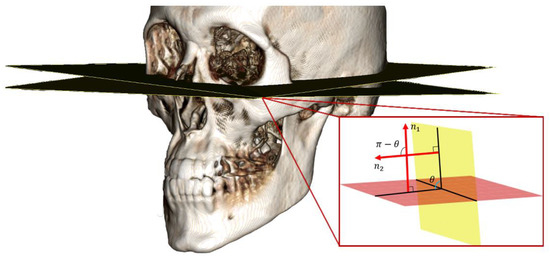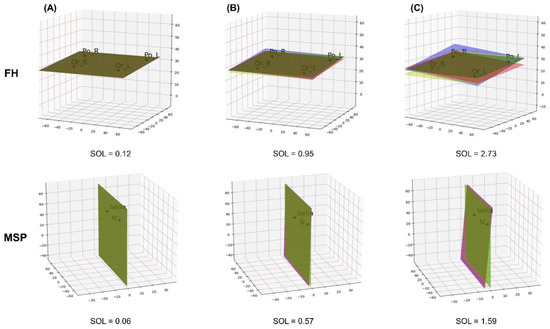 where are normal vectors of two planes and denotes the Euclidean norm (Figure 2). SOL acts as an indicator of deviation between the planes, such that an increase in SOL represents an increase in the variation between the FH and MSP planes. The FH plane and MSP plane measures for each patient were calculated using Pytorch (v1.5.1) software.