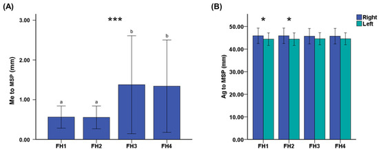 Considering the significant difference in the anterior mandibular landmark, Me, with MSP in transverse measurement, we conducted a further statistical analysis of the bilateral variation for Ag (posterior mandibular landmark). There was a statistically significant difference (p < 0.05) between the right and left sides for both FH1 and FH2 groups. Despite similar patterns (right > left) of transverse measurements at Ag among all four groups, FH3 and FH4 showed no statistically significant difference.