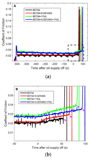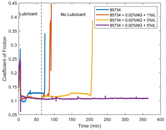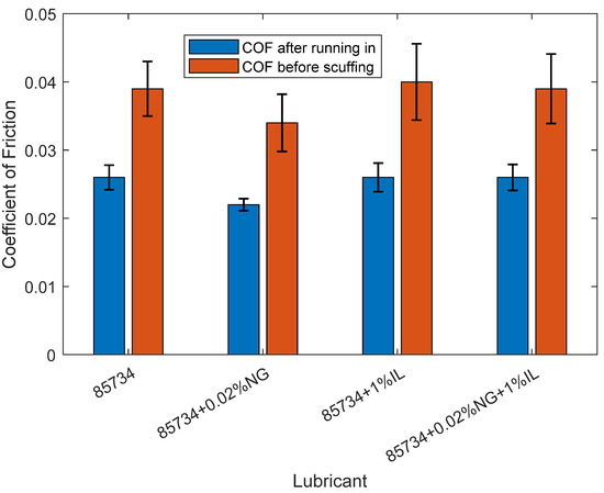 In addition to observing the time to onset of scuffing of the steel specimens, the COF with the lubricant blends was extracted at key points. The COF during the ball-on-disk, loss-of-lubrication experiment was taken at the two points of interest shown in Figure 2, immediately before the lubricant supply was cut and immediately before scuffing. The mean values for the multiple runs of each lubricant blends are shown in Figure 4. The COF was similar for the baseline oil and the two blends with IL additive, around 0.026, before lubricant was cut and 0.039–0.040 immediately before scuffing. Only the DoD-PRF-85734 + 0.02 wt% NG blend differed in that it had a lower COF both before lubricant was cut (0.022) and before scuffing (0.034). An ANOVA analysis gives a p-value of 0.003 for the COF before lubricant is cut and p value of 0.104 for the COF before scuffing. A low p-values indicates a low probability of sampling error producing a difference between the groups as large as those observed here.