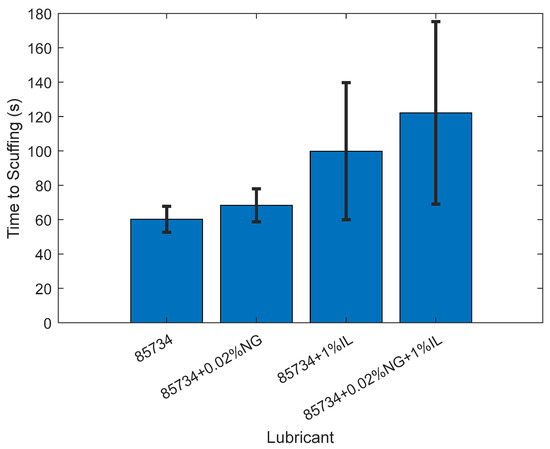 Average time to initiation of scuffing after shutting off oil supply in ball-on-disk, loss-of-lubrication experiments. Error with 95% confidence interval.