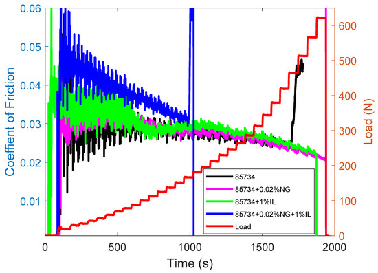 COF and applied load during scuffing load experiments.