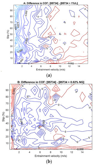 Difference in COF under different contact velocity conditions between the lubricant blends and baseline lubricant. (a) 85734 and 85734 + 1 wt.% IL, (b) 85734 and 85734 + 0.02 wt.% nanoscale graphene (NG).