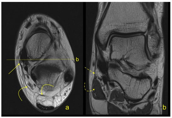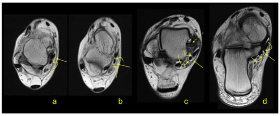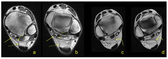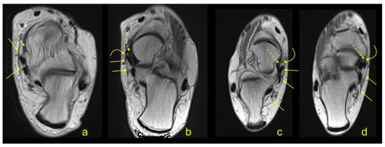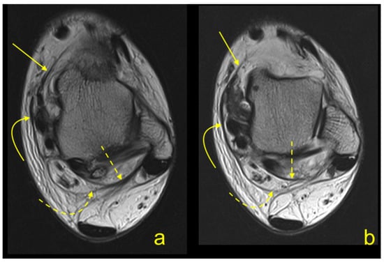 - Numkarunarunrote, N.; Malik, A.; Aguiar, R.O.; Trudell, D.J.; Resnick, D. Retinacula of the Foot and Ankle: MRI with Anatomic Correlation in Cadavers. Am. J. Roentgenol. 2007, 188, W348–W354. [Google Scholar] [CrossRef]