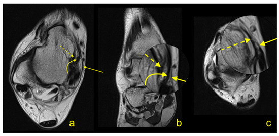 - Lewis, S.D.; Chew, F.S. Ankle medial flexor retinaculum avulsion fracture. Radiol. Case Rep. 2019, 14, 1144–1147. [Google Scholar] [CrossRef] [PubMed]