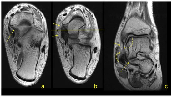 - Crim, J. Medial-sided Ankle Pain: Deltoid Ligament and Beyond. Magn. Reson. Imaging Clin. N. Am. 2017, 25, 63–77. [Google Scholar] [CrossRef] [PubMed]