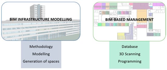 Further to these examples, the development of a service management system of the infrastructure must be highlighted. The application of BIM stands out in hospital infrastructure facilities, airports or university campus [13] for space management. This is because most BIM applications are related to new infrastructure [3,14,15,16,17,18] instead of already existing buildings [19,20]. However, advanced society requirements, such as sustainability, have created a new tendency in implementing BIM for existing buildings [19,20,21,22,23,24].