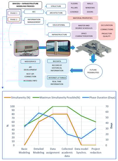 The methodology adopted for the execution of this project consisted of several phases defined in the BEP in which different aspects were addressed together and resulted in one efficient model based on BIM methodology. This project was focused on research and the development of an efficient BIM management methodology, only the main points related to UNE-ISO 19650-1 [25] and UNE-ISO 19650-2 [26] being considered. Asset Information Requirements (AIR) and Project Information Requirements (PIR) were also detailed in BEP. Given the nature of this project, other points, such as a responsibility matrix or Organization Information Requirements related to legal issues, were not considered. The phases were independently developed by having temporal coincidence, as is shown in Figure 2.