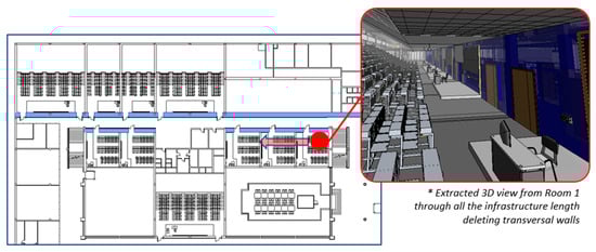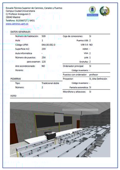 The ETSICCP model contemplates the possibility of hosting IoT by means of sensor systems able to provide real time information to a database getting close to the concept of “Smart Building” [35] with great operation efficiency in terms of information handling [36,37] improving BIM information with real time data extremely important in special infrastructure, such as a Campus, airports, or even hospitals [38,39].