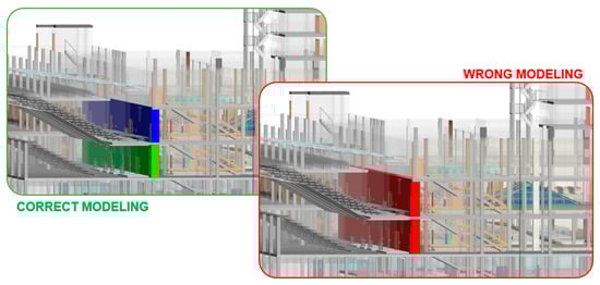 The involved objects included in this base model contained some peculiarities that must be recognized, mainly in the modeling of walls. As commented in previous sections, the modeling was organized level by level and this procedure was of critical importance due to the particularities of the “wall” components. The initial temptation is to model walls, especially façades, considering the total height that a façade wall creates as beginning at level 0 and ending at level 3. Modeling with this methodology will lead to errors in terms of material measurements at a level. The origin of this error is the BIM software for wall accounting, that is, if a reform is intended partially affecting to level 2 of the infrastructure, the wall starting at level 1 through level 3 will not be accounted for. In order to have it accounted for by the software, the modeling must be organized level by level, which means having the façade modeled in several walls, one from level 0 to level 1, next from level 1 to level 2, and a third one from level 2 to level 3. In this way, the accounting will be exact, independently of the level at which the data is filtered.