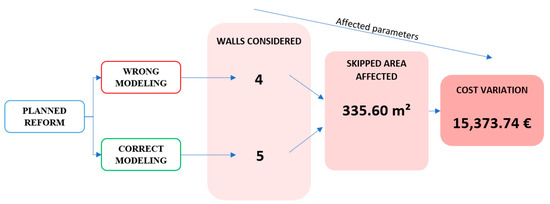 With the objective of supplying the university with a model that can be used not only for space management but also for budgeting future reforms or changes in the infrastructure, modeling has been done according to the described methodology to avoid the cited errors. This is of key importance, as shown in the following case, where the error in quantities and budget of a partial reform in the ETSICCP was shown. The reform is supposed to affect only the first floor, which is level 1. The rehabilitation of the corridors close to classrooms 26 and 27, as shown in Figure 4, is intended. Shaded in blue in Figure 3, the walls affected by this reform are highlighted. In terms of location, the affected wall is similar in level 0 and level 1, having an end in level 2, so that if the wall has been modeled from level 0 through level 2, wrong modeling occurs, as is shown in Figure 5. When the data is filtered by the level and the acting zone, this wall will not be reflected in the quantities list. An example of quantities and budget with a wrong modeling is shown in Table 3. The unit price adopted for the reform is the one proposed by the official Price Generator of Madrid Community.