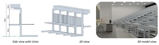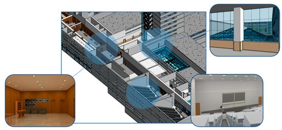 - Detailed model: it considered specific elements that allowed the differentiation and identification of the infrastructure. In this phase, the BIM model file starts to house unique components, such as lockers, desks, projectors, pictures, or textures that were modeled in detail separately, and inserted to the file with the complete infrastructure model afterwards.
