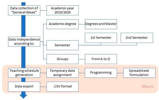 - Stage for data assignments to the model: was given 40-day duration and will take place simultaneously with the previous stage. A database is compiled using spreadsheets in which all the time-schedules of the 2019–2020 academic year are filled in for each of the two degrees and four masters. The database is compiled for each of the cited degrees and for each of the student groups and covers all the teaching offer in this School.