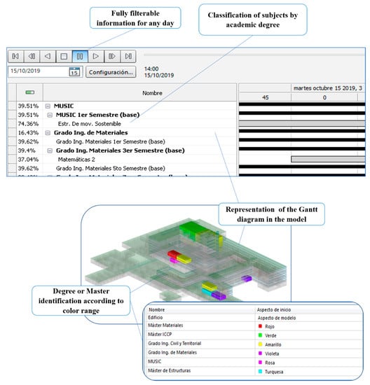 Table 1 shows the useful area of all the classrooms, with a total surface of 5,289.329 m2. The table was originated from the BIM model by making a constant relationship between the model and either a spreadsheet or any SQL database, so that any information in the model can be reflected instantly in the database and vice-versa.