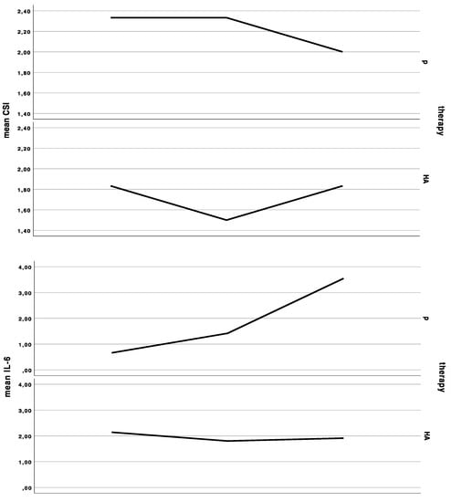Curves indicating the mean clinical severity index (CSI), mean interleukin-6 (IL-6) levels in saliva, mean Oral Health Impact Profile (OHIP) summary score at the first baseline, cross-over, and last appointment in the group starting with placebo (p), and in the group starting with hyaluronic acid (HA), either for 6 weeks and a wash-out period of 48 h in between treatments.