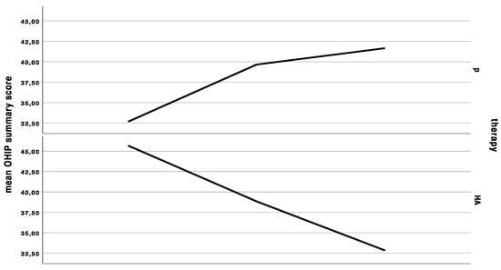 The baseline OHIP was 41.3 ± 13.7. OHIP decreased by significantly less (Wilcoxon rank sum test with continuity correction: V = 44, p-value = 0.01269, adjusted p = 0.152) under HA treatment (OHIP change compared to baseline: −0.4 ± 14.6) compared to placebo treatment (OHIP change compared to baseline: −7.3 ± 14.7) (Figure 1). The baseline dimension oral function was 1.8 ± 1.8, which increased by 0.3 ± 1.5 under HA treatment and did not change under placebo treatment (0.0 ± 1.9). There was no significant difference between HA and P (Wilcoxon rank sum test with continuity correction: V = 8, p-value = 0.345, adjusted p = 1.0). The baseline dimension “orofacial pain” was 9.8 ± 4.9, which dropped by −0.6 ± 5.7 under HA and –2.4 ± 5.8 under placebo treatment (Wilcoxon rank sum test with continuity correction: V = 25, p-value = 0.3592, adjusted p = 1.0). The baseline dimension “psychosocial impact” was 2.8 ± 2.6, which did not significantly differ (Wilcoxon rank sum test with continuity correction: V = 1.5, p-value = 0.269, adjusted p = 1.0) after HA treatment (0.0 ± 1.2) and P treatment (0.6 ± 2.1). The baseline dimension “appearance” was 3.8 ± 2.1, which significantly differed between both groups (Wilcoxon rank sum test with continuity correction: V = 26.5, p-value = 0.039, adjusted p = 0.385). The appearance score increased under HA treatment 0.8 ± 1.6 and decreased under p treatment −0.4 ± 1.9.
