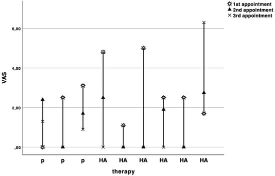 Curves indicating the visual analogue scale values in cm for each patient at baseline (1st appointment), cross over (2nd appointment), and recall (3rd appointment). P indicates the patients starting with placebo, and HA indicates the patients starting with hyaluronic acid.