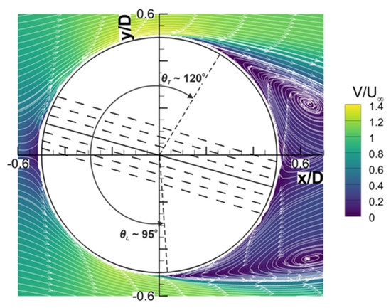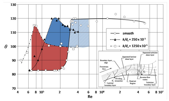 Achenbach published the results from a definitive set of experiments showing how the Reynolds number affects the location of boundary layer separation on hydraulically-smooth spheres [6]. These locations were derived from skin-friction measurements; the results are presented in Figure 2, denoted by the open circles. Below a critical Reynolds number of Re = 2 × 105 (i.e., sub-critical flow), Achenbach showed that the boundary layer is laminar and the adverse pressure gradient on the sphere causes it to separate at around θL~80°. Within the critical flow regime (2 × 105 < Re < 4 × 105), the boundary layer transitions to turbulence and the separation angle is delayed to θT~120°. As the Reynolds number increases beyond critical flow to a supercritical flow regime, the point of boundary layer separation gradually retreats upstream. It was later shown by Taneda, using oil flow visualization on a smooth sphere, that the increase in separation angle at the critical Reynolds number is associated with an LSB—see inset in Figure 2 [7]. An LSB forms as the laminar boundary layer separates from the sphere (θL) before transitioning to turbulence and reattaching downstream (θR); the turbulent boundary layer separates yet further downstream (θT). Taneda measured 92° < θL < 110°, 107° < θR < 127°, and 123° < θT < 147° (depending on Re). Importantly, θT is larger in the presence of an LSB during the critical flow regime, than in the absence of the LSB during the supercritical flow regime.