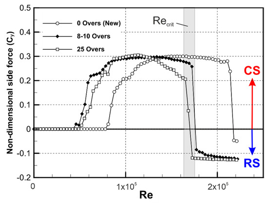 Variation of non-dimensional side force (Cy) with Reynolds number (Re) for Dukes balls at different stages of wear, showing the transition from CS to RS. The double-sized ball used in this paper is comparable in surface roughness to the 25-over-old ball. The critical region for the 25-over-ball is highlighted (1.65 × 105 < Recrit < 1.75 × 105). Adapted from [4].