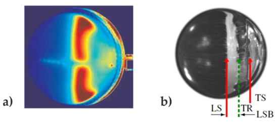 The presence of the LSB on a non-rotating cricket ball was first demonstrated by Scobie et al. [5] and later validated by Deshpande et al. [14]. Scobie et al. demonstrated this phenomenon using heated flow visualization and pressure measurements on both a double-scaled ball and on actual cricket balls aged under first-class match conditions. Deshpande et al. modelled a cricket ball as a sphere with a trip to act as the seam, showing the formation of the LSB using oil flow visualization experiments in a wind tunnel. Images from the above papers are shown in Figure 4. Deshpande et al. also showed that an LSB forms over the SS at low Re during the CS regime. Earlier experiments by Deshpande et al. [15] demonstrated the instability and intermittency of an LSB over a smooth sphere, by means of unsteady force and pressure measurements. They found that the critical flow regime can be further categorized into three sub-regimes based on the nature of the LSB.